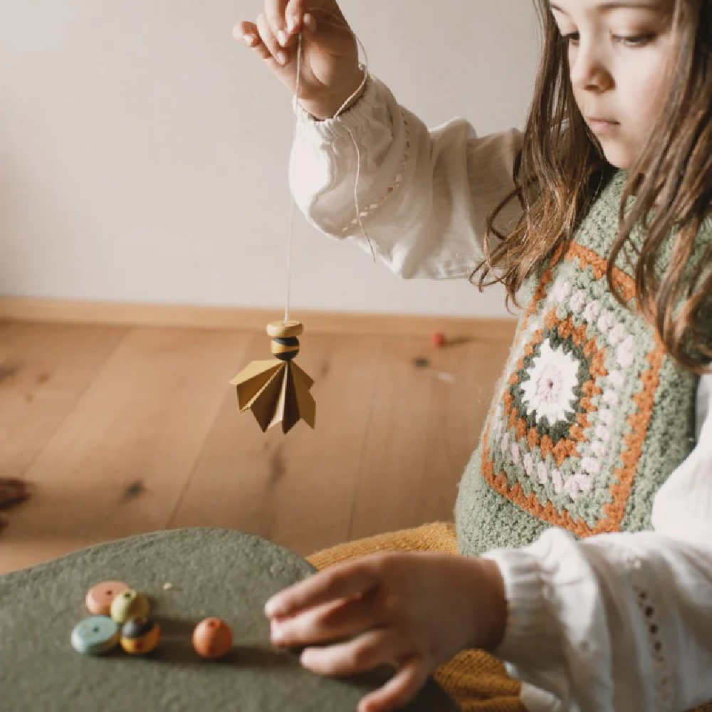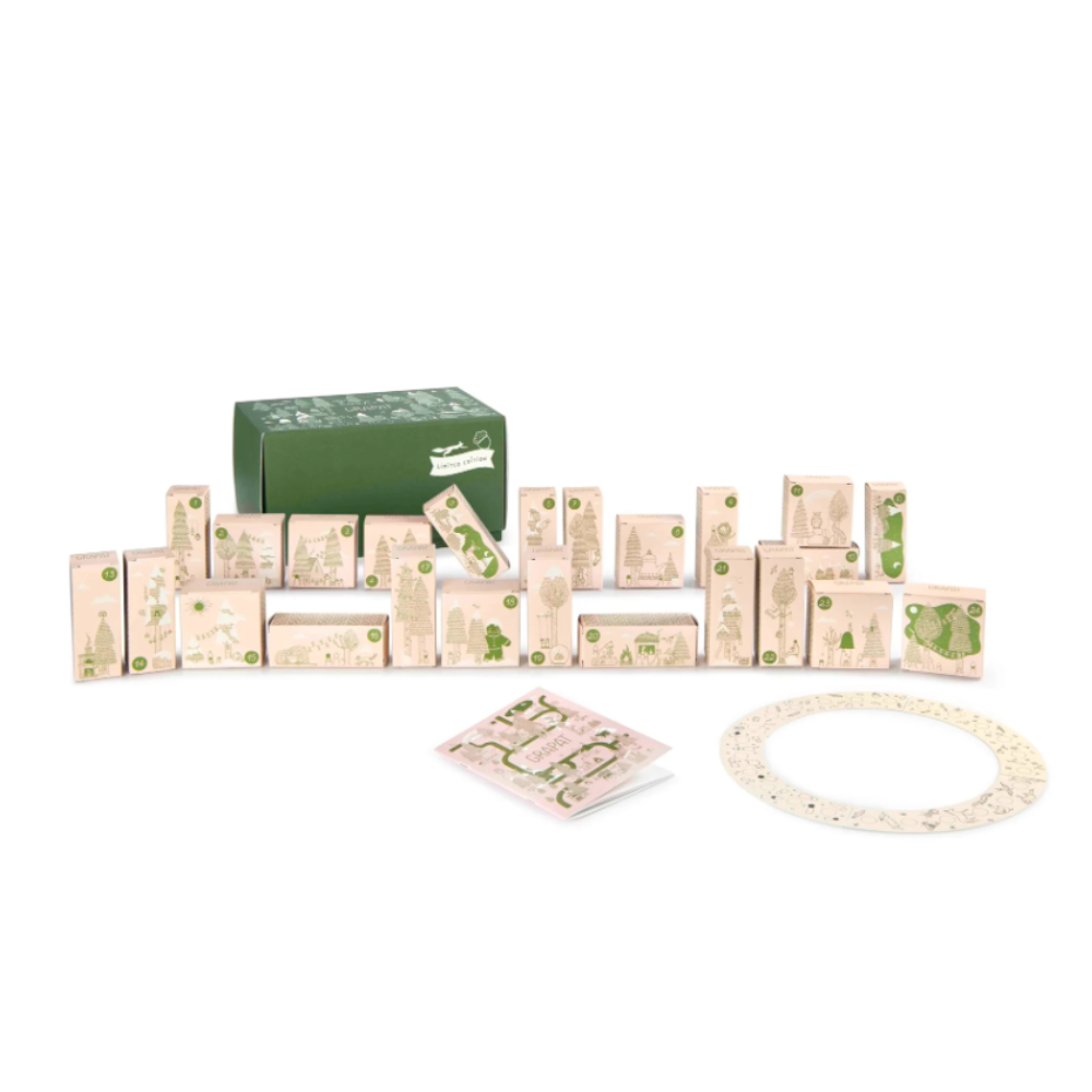 More than 180 pieces in different materials: wood, fabric, threads, wool, and much more. The box also includes a book with invitations to play, craft and share time together. In the box you can also find an original cardboard circle to be used as an advent crown countdown with some little dots you’ll find while the numbered boxes are opened day by day.