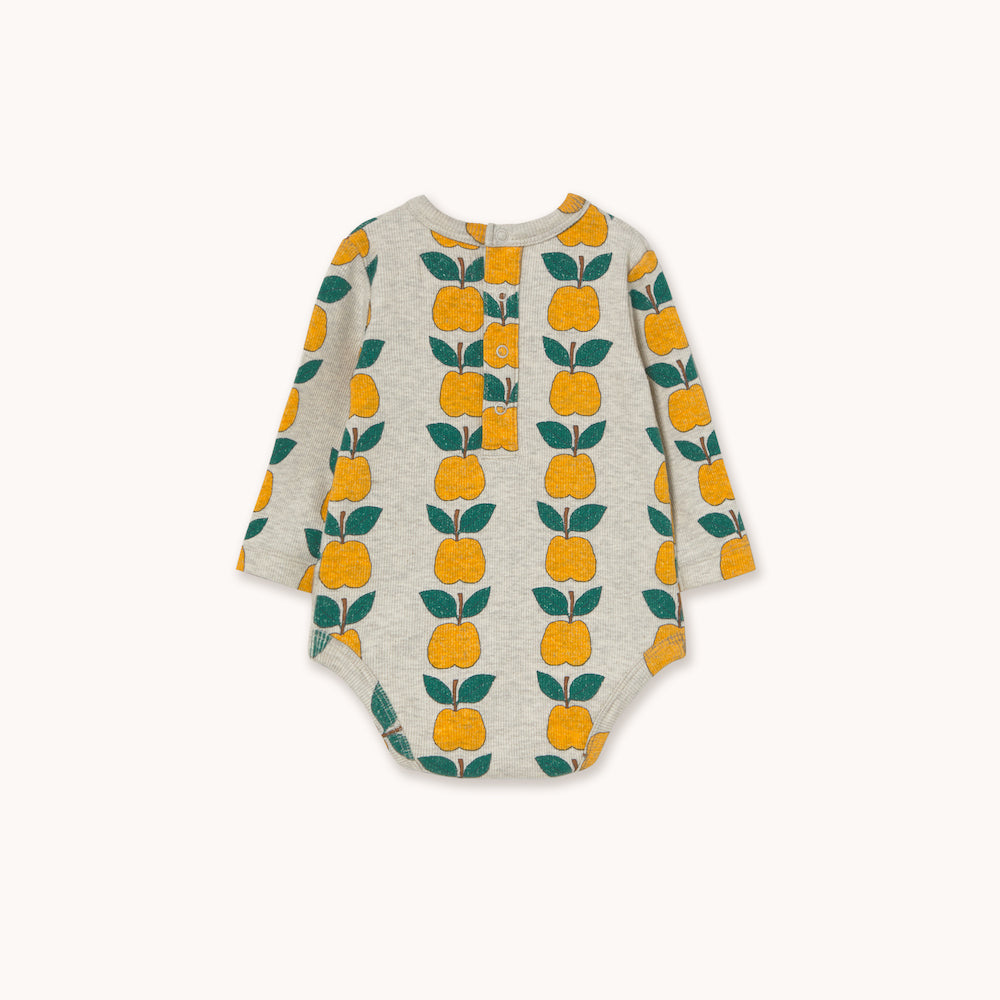 This colourful Apples printed rib body is crafted from a soft cotton blend, offering a breathable feel. It features a comfortable, relaxed silhouette with long sleeves and a snap opening at the bottom.