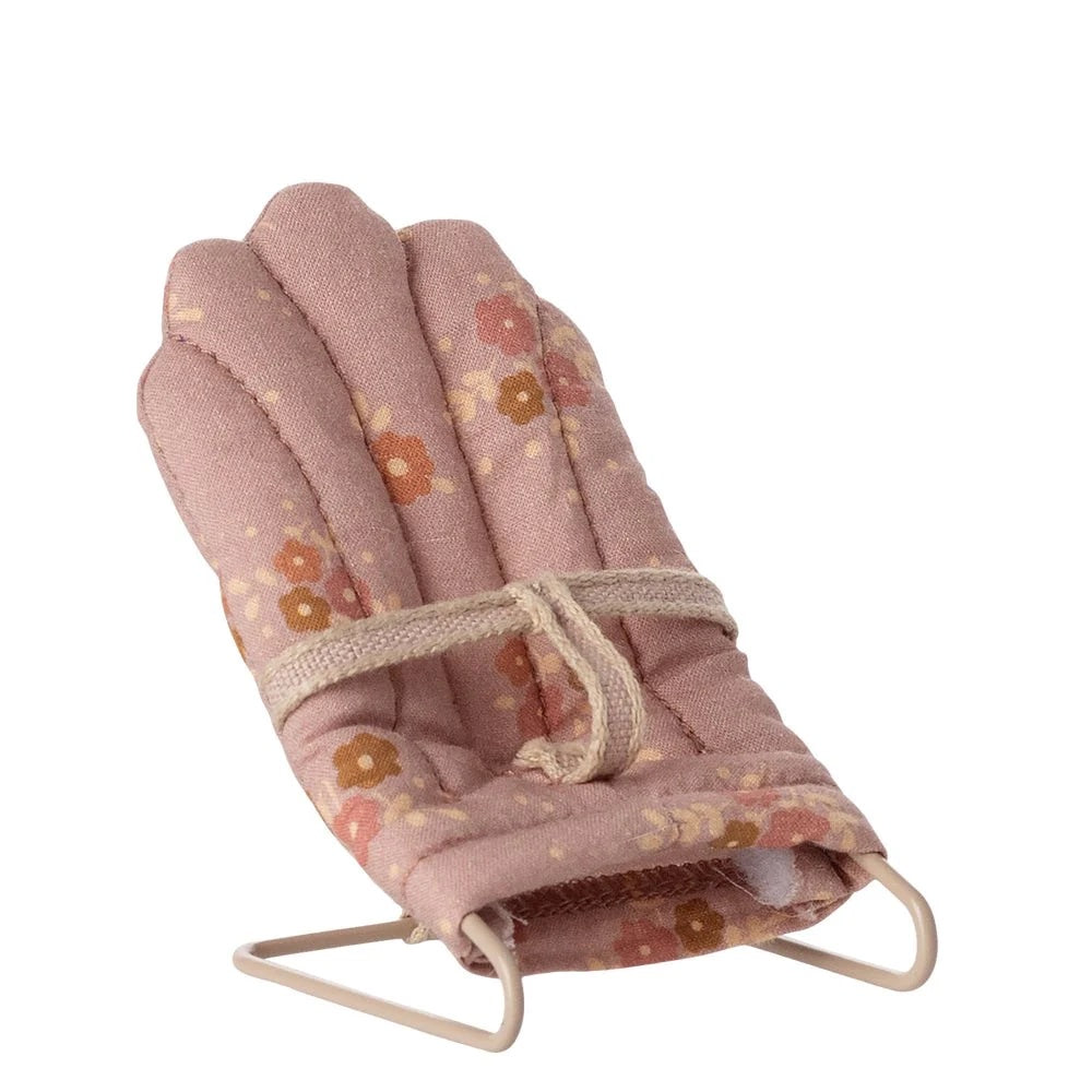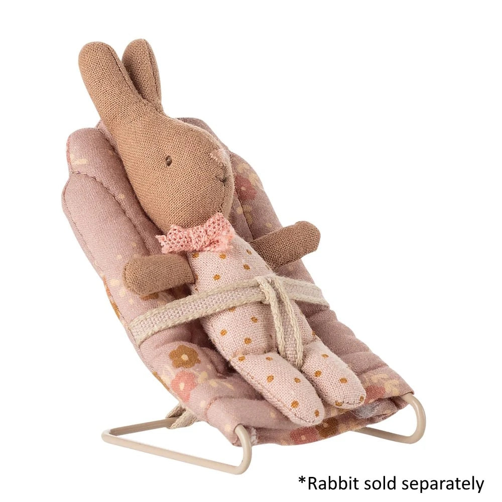 Make space for sweetness with the Maileg Babysitter My in Rose, perfectly designed for your tiniest Maileg companions. Featuring a soft pink floral print, this charming babysitter includes a scallop-edged padded cushion and a fabric harness to keep baby mice or My-sized bunnies and rabbits cosy and secure. With its delicate tones and vintage-inspired detailing, it adds a lovely touch to any Maileg nursery scene. A delightful accessory for imaginative, storybook play.
