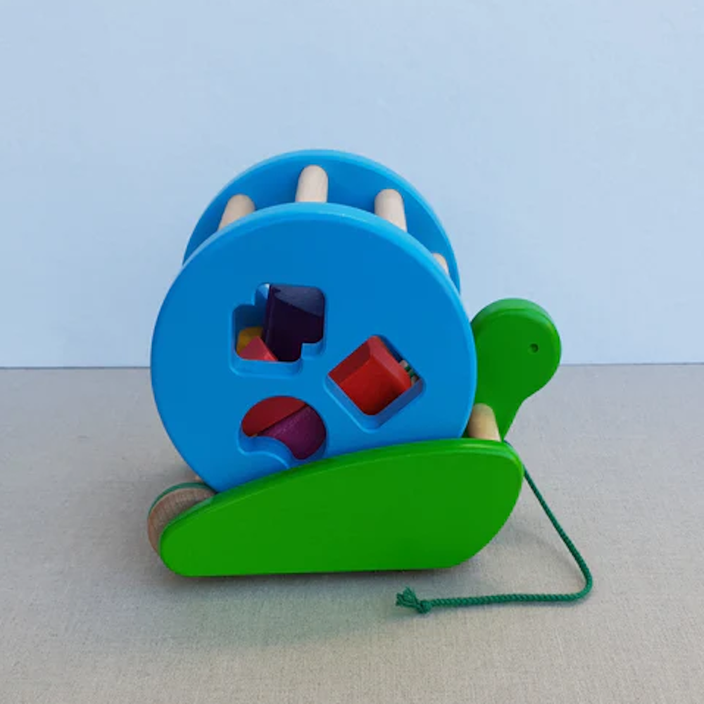 This Bajo snail sorter pull along toy is a smooth rolling snail that can be pulled along wherever your little one may wonder. When the base is pulled along, the timber cylinder spins around creating a rainbow of colour. The shape sorter cylinder, with 6 colourful wooden shapes, can be used independently from the pull along base by matching the shapes to the holes on either side of the cylinder. Younger children can use the snail shell as a large rolling rattle.