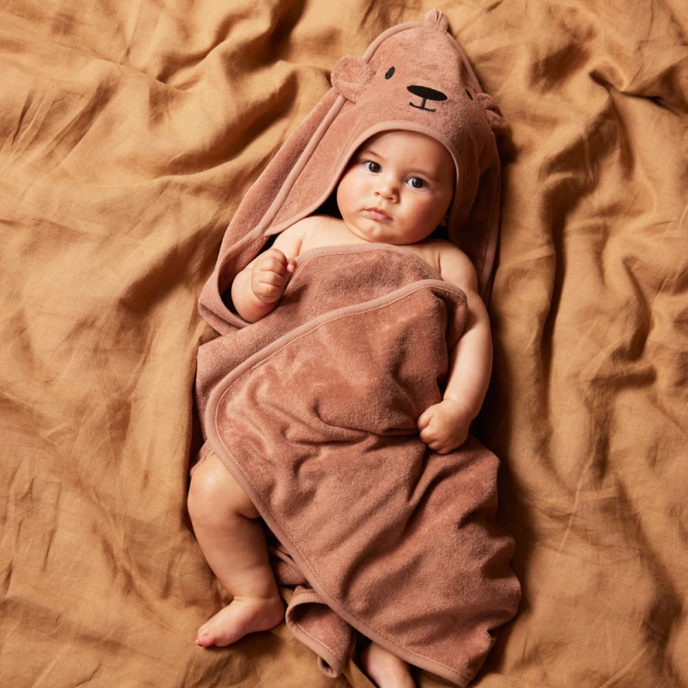 Wrap baby up nice and snug after bath time with this soft and luxurious hooded towel. The cosy hood features adorable bear ears and cotton embroidery detailing.
