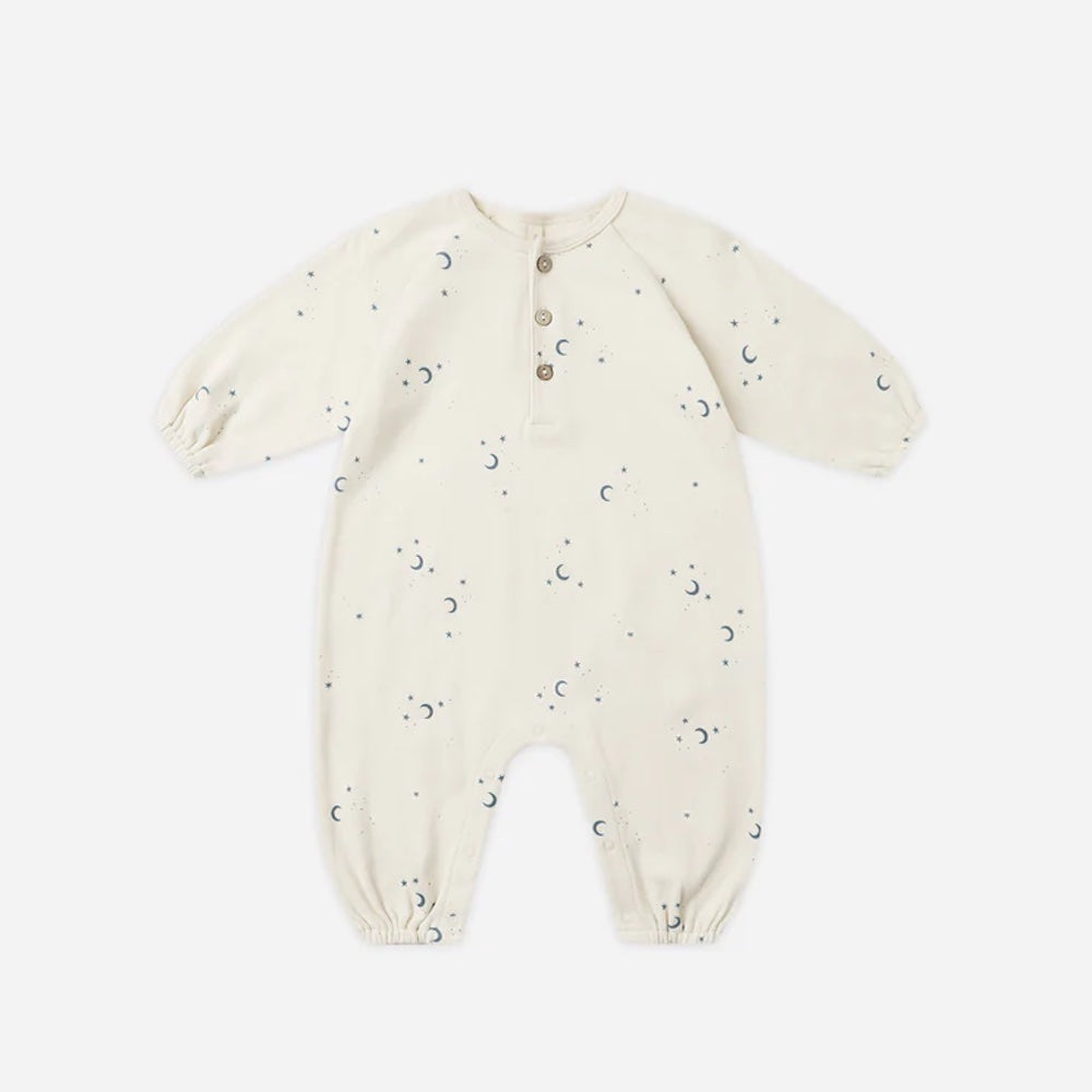 This long sleeve jumpsuit features a coconut button placket and elasticized sleeve and leg openings for a darling bubbled silhouette. Snaps along the inseam make for easy changes.
