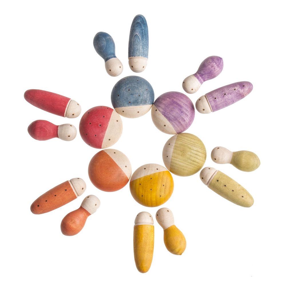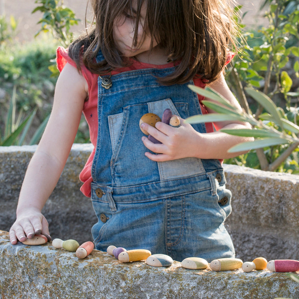 The Grapat wooden Insects are small wooden elements with an undefined shape, allowing children the space to imagine small creatures and animals as they please. This symbolic set of 18 insects is another inspiring open ended element that can be used in an unlimited number of ways.