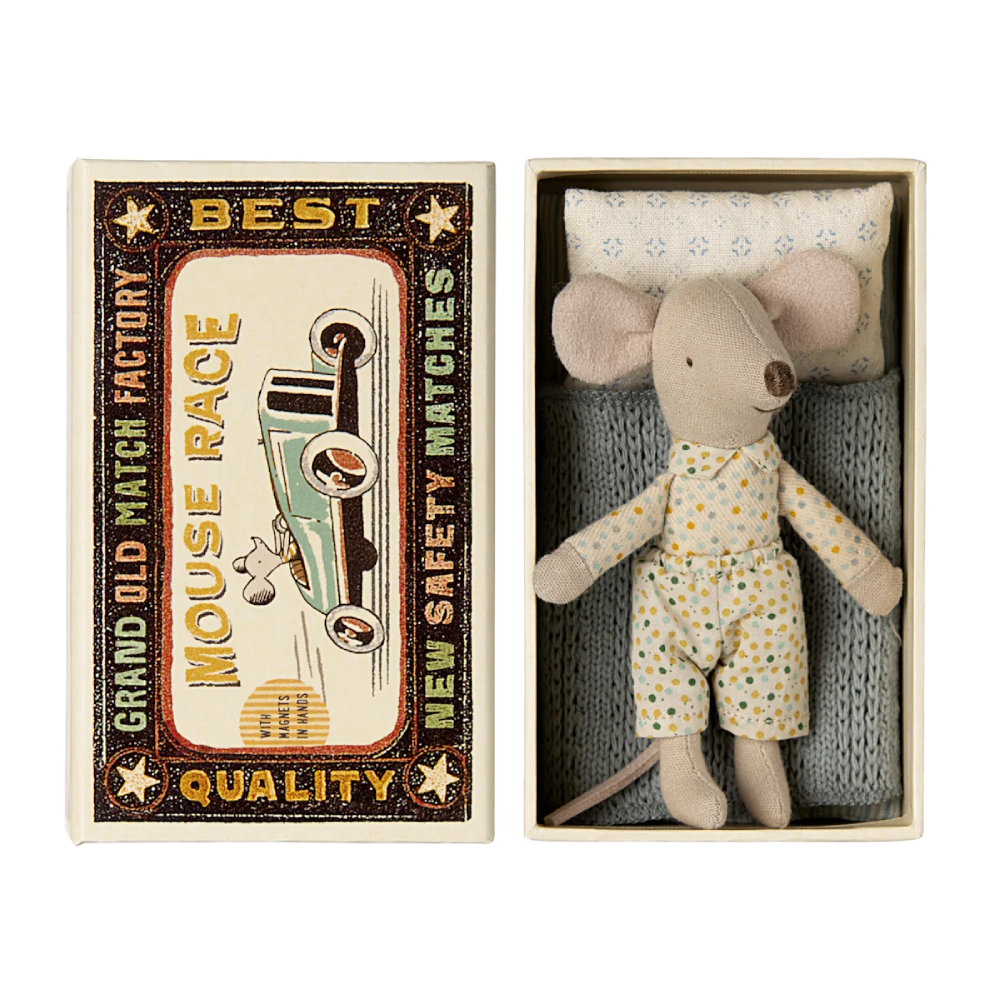 A classic Maileg item. This mouse is ready for hours of play and sleeps snuggly in their little matchbox. The clothes and bedlinen are made of soft fabrics with unique prints in beautiful colours. Extend the story by adding accessories from the Maileg range.