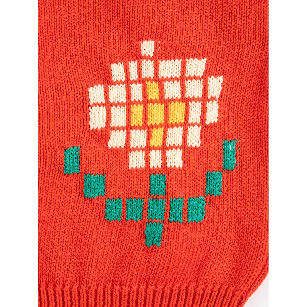 Red cardigan. Designed with long sleeves, dropped shoulder, front button fastening, shoulder button fastening, ribbed cuffs, embroidery, intarsia, fine knit, loose fit, ribbed bottom and round neck.