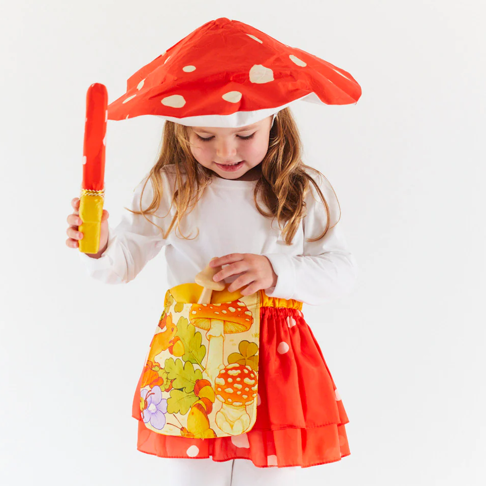 The Mushroom Dagger is a safe and soft accessory for little ones' imaginative play. The foam dagger is covered in luminously textured jacquard silk, in our best selling Rainbow colorway for magical make believe play.