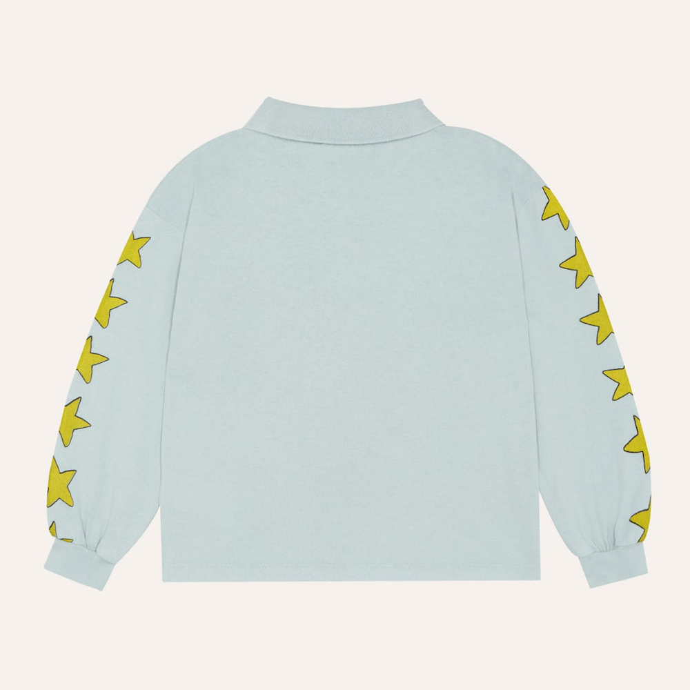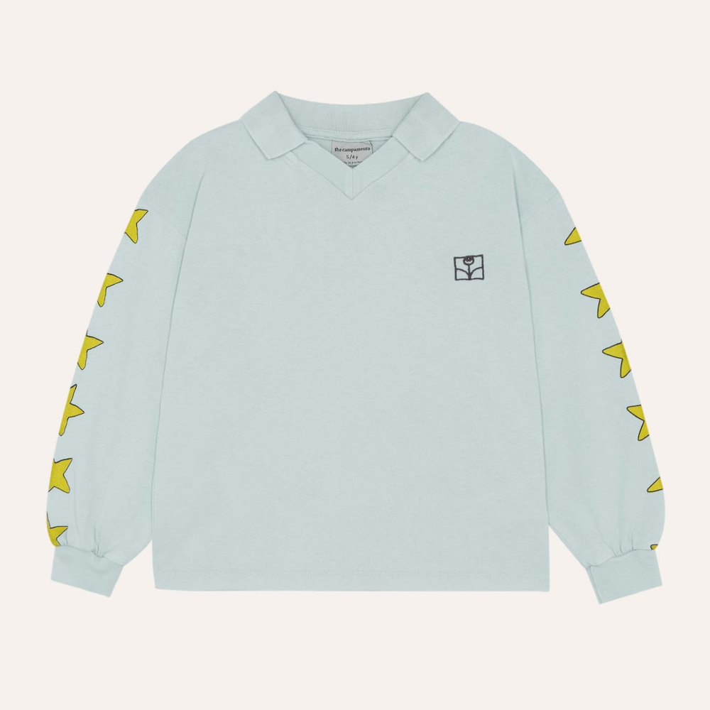 Retro vibes in this blue washed polo with star printed on the sleeves. With oversized fit and rib in cuffs for more comfort. It is a very versatile garment that close any summer outfit.