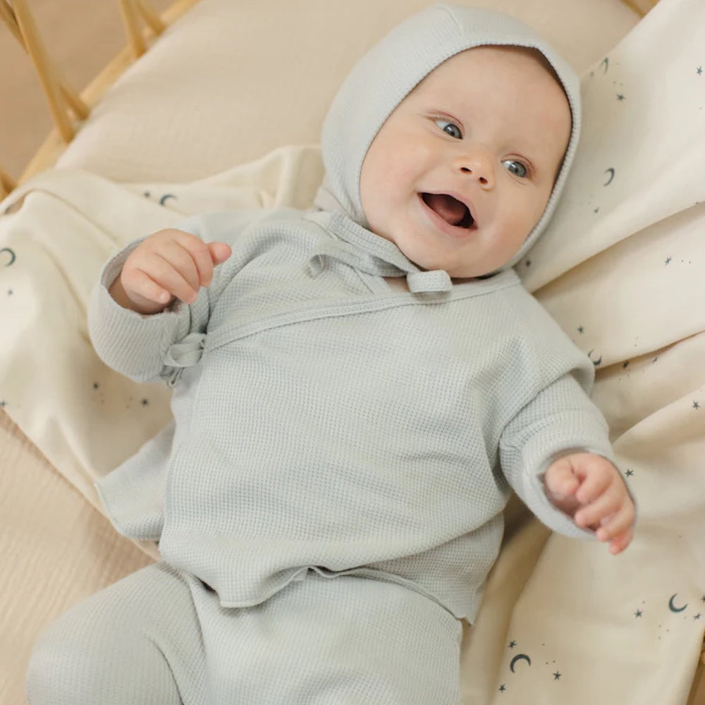 Our Take Home Set in soft, lightweight waffle fabric is the perfect outfit for welcoming your newborn. This sweet set includes a bonnet, a wrap snap and tie top, and footed drawstring pants.