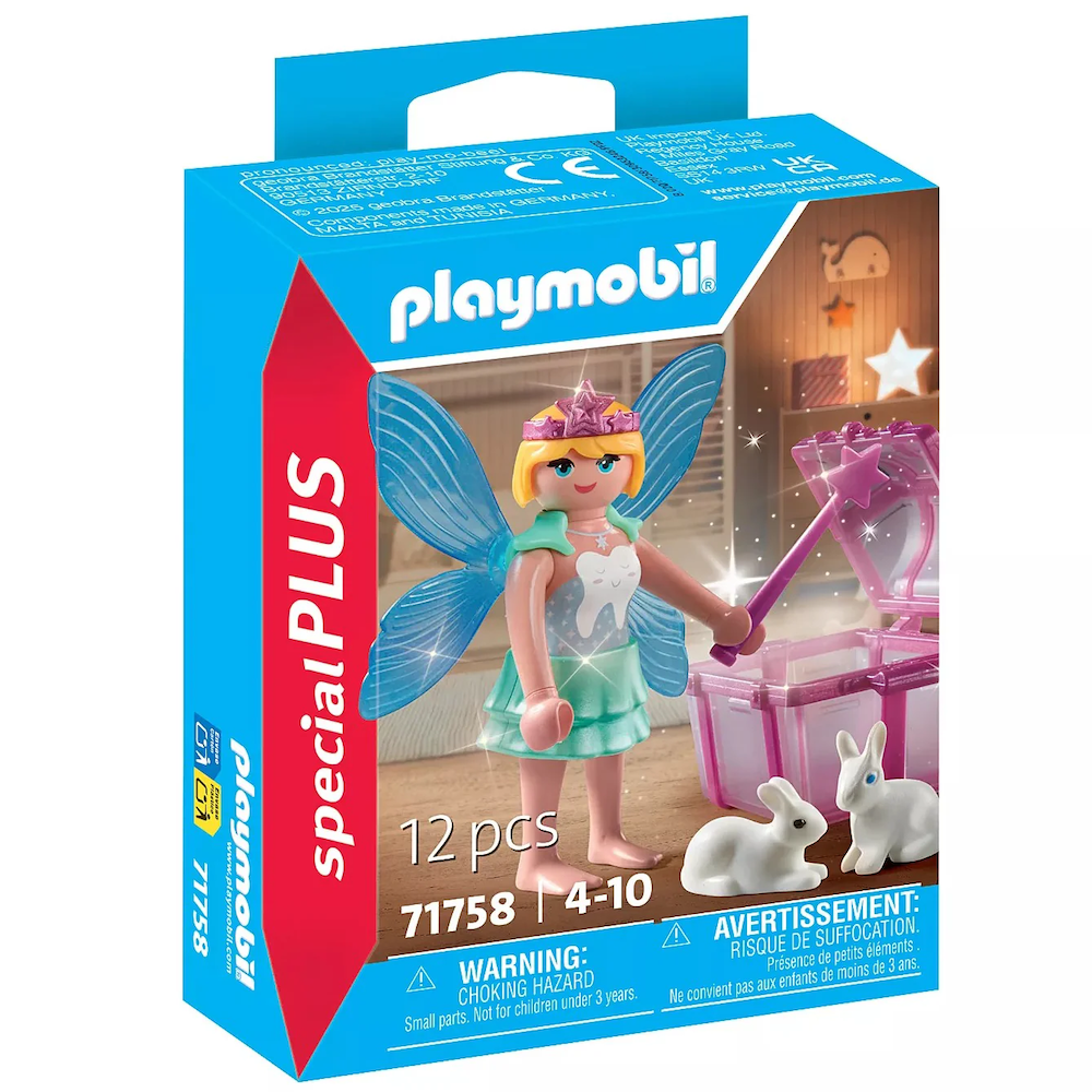 PLAYMOBIL Special Plus Tooth Fairy with magic wand, treasure chest, and two rabbits. On her nightly visit, the friendly fairy is accompanied by two cute companions. The small chest provides ample space for storing your milk teeth.