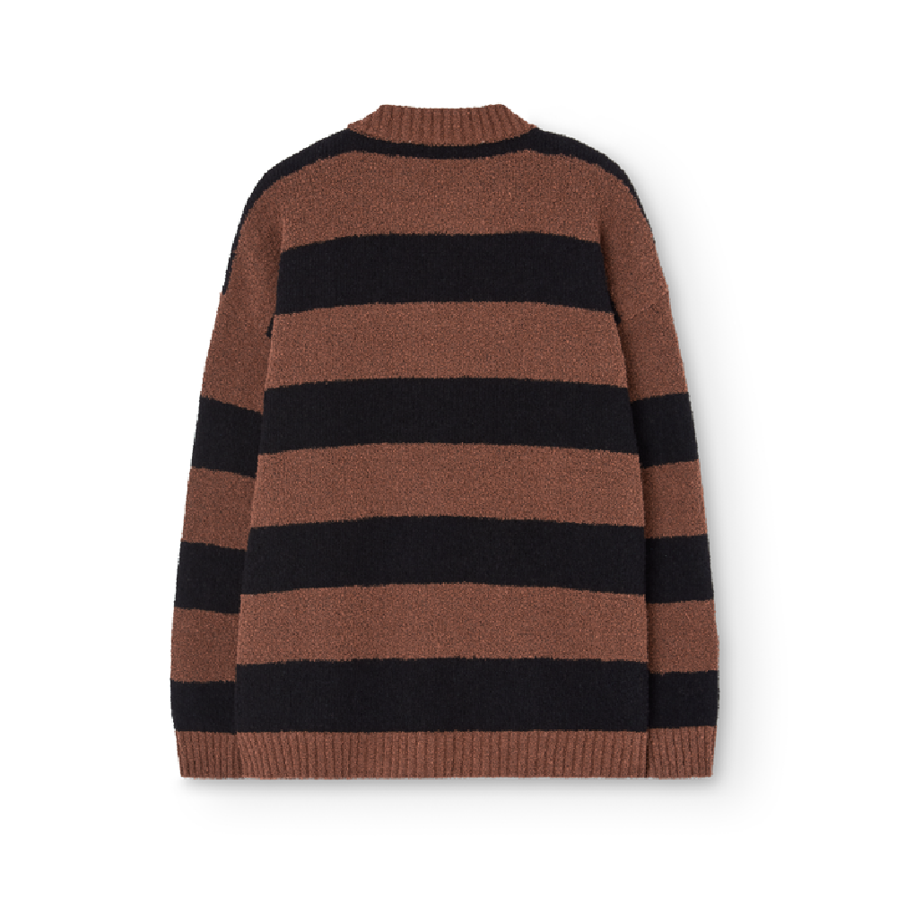 A brown striped cardigan designed for comfort and timeless charm, ready to accompany every exploration. Crafted for little ones who love expressing themselves through kids designer clothes.