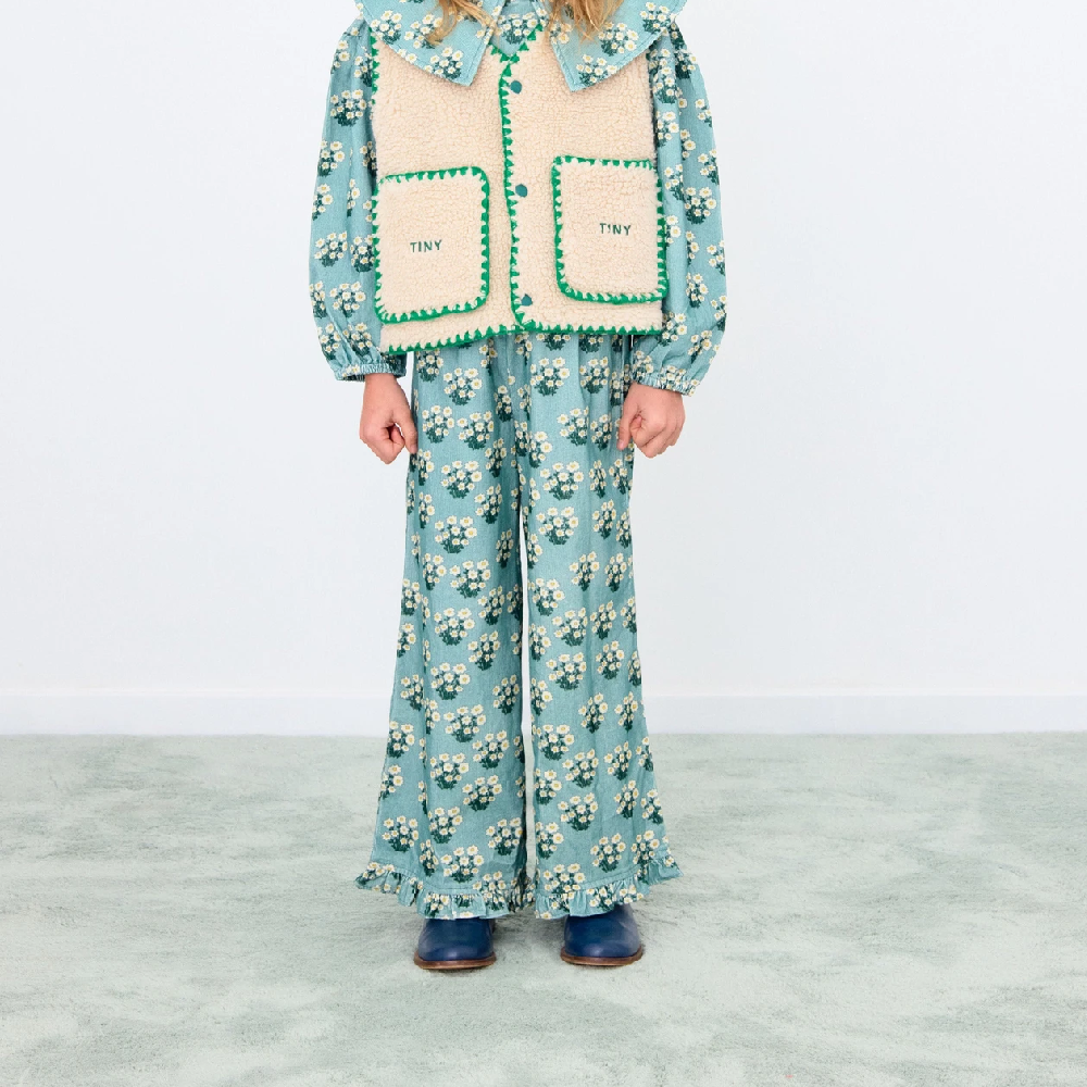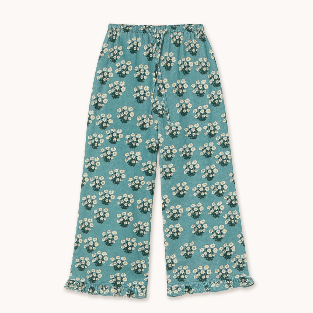These White Bouquet print pants are crafted from soft 100% cotton corduroy fabric. Featuring a classic fit with an elasticated waistband, back pockets, and frilled hems, they offer both comfort and style. Perfect for lounging or everyday wear, their functional design ensures ease all day long. A versatile piece that adds a subtle playful touch to casual looks.