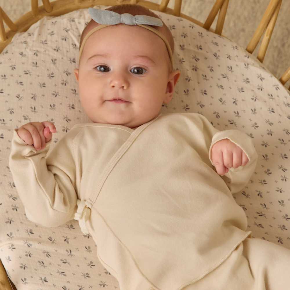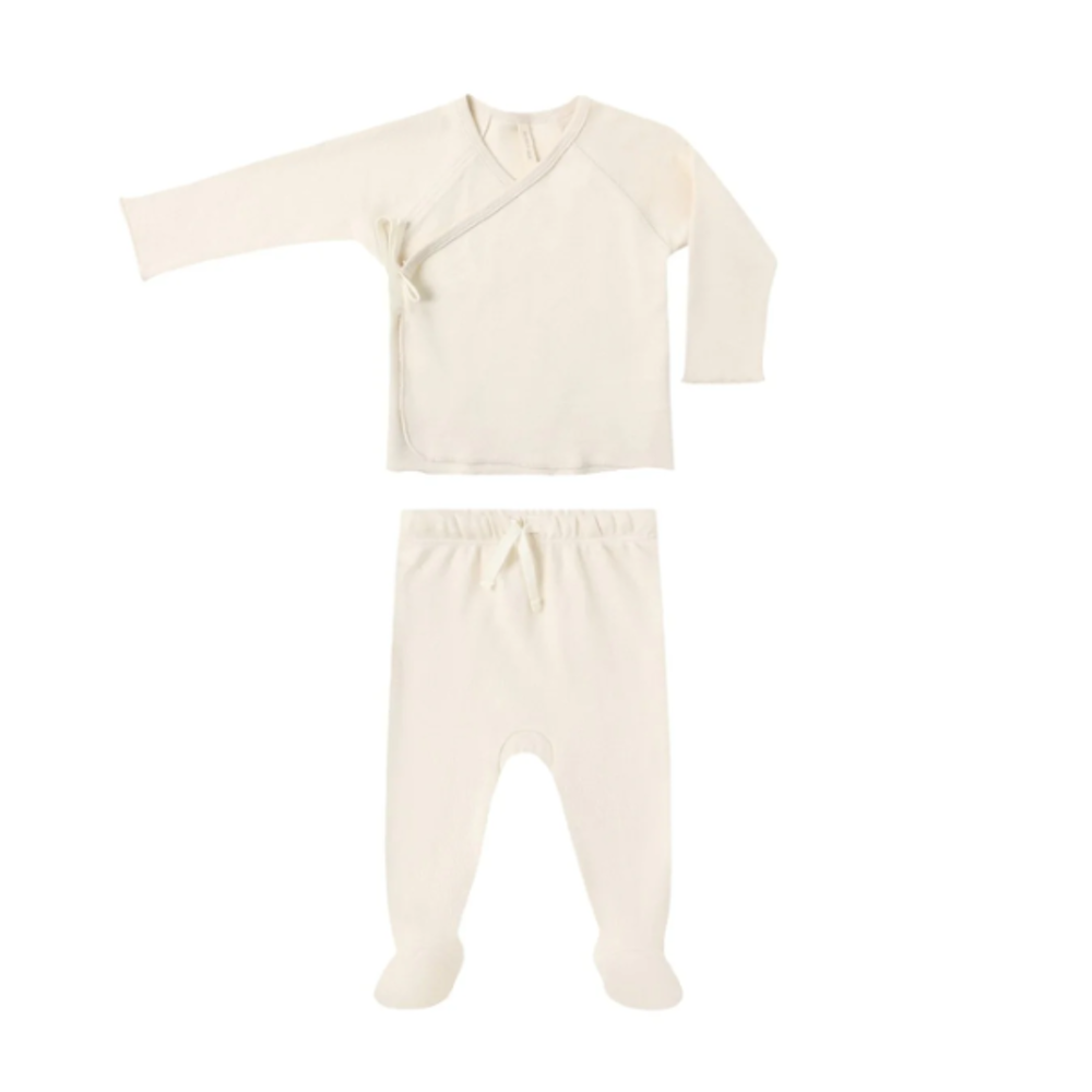 Bring baby home in this sweet set, featuring a long sleeve wrap top with an inside snap and a side tie, paired with matching drawstring footed pants for a cozy, coordinated look.